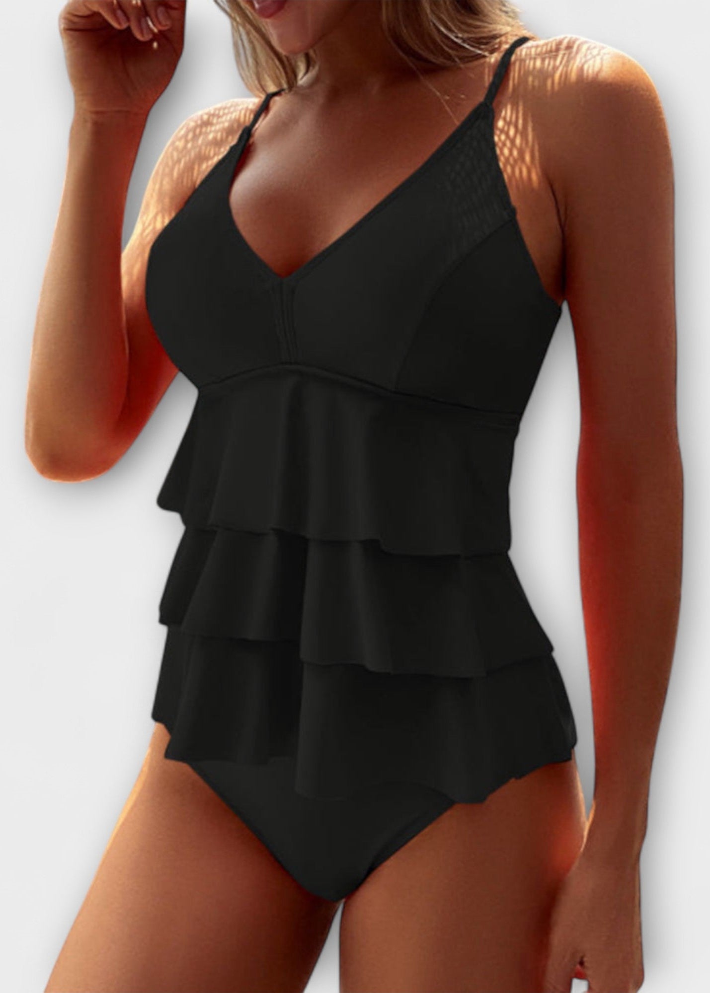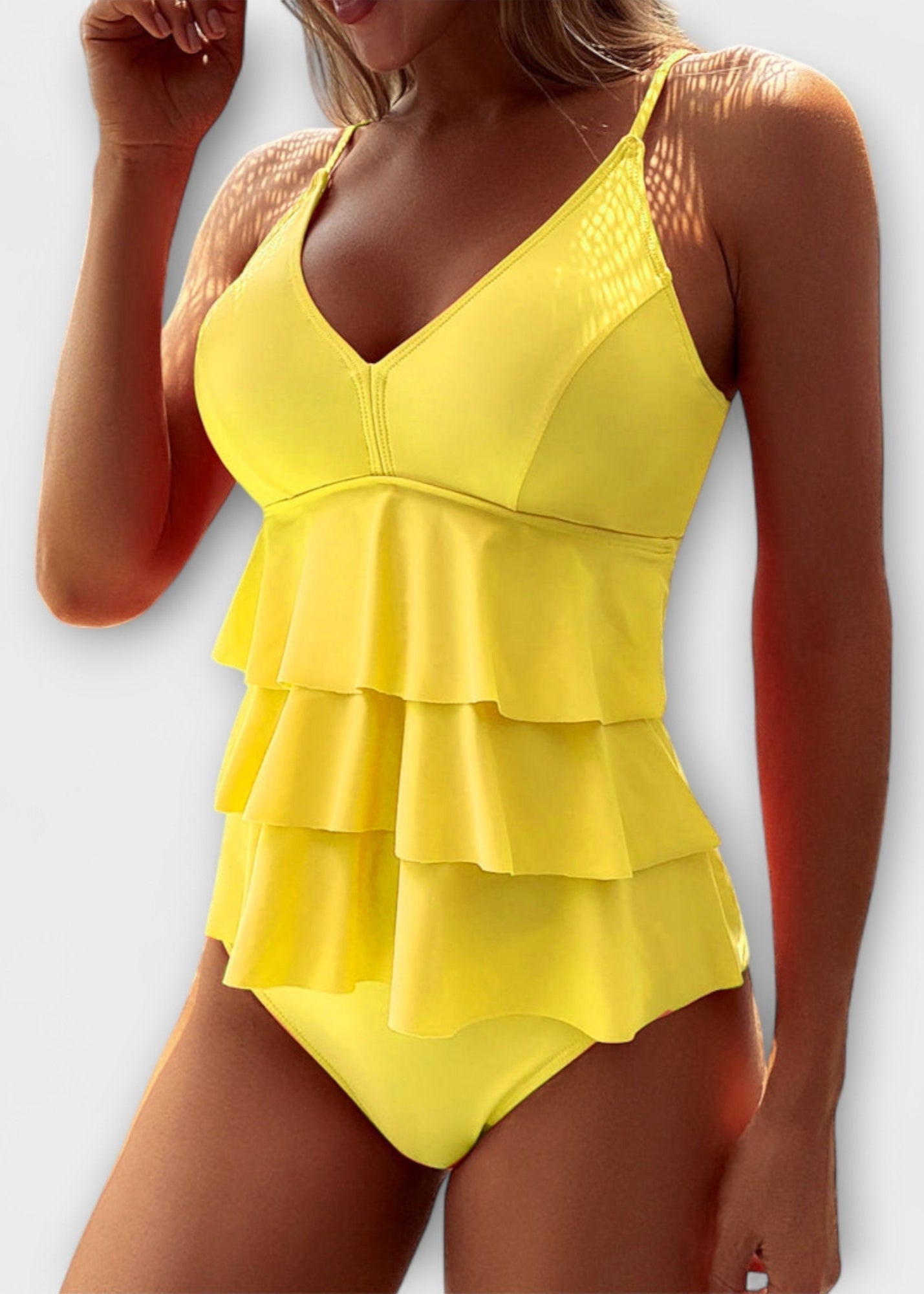 Affirmez votre style avec l'élégante de bikini, conçue pour passer sans transition de la détente à la plage à une séance de shopping décontractée. Avec son décolleté en V flatteur et ses volants superposés élégants, cette robe de bain apporte une touche de sophistication à votre collection. Confortable, elle peut être portée toute la journée, en vacances comme au quotidien.