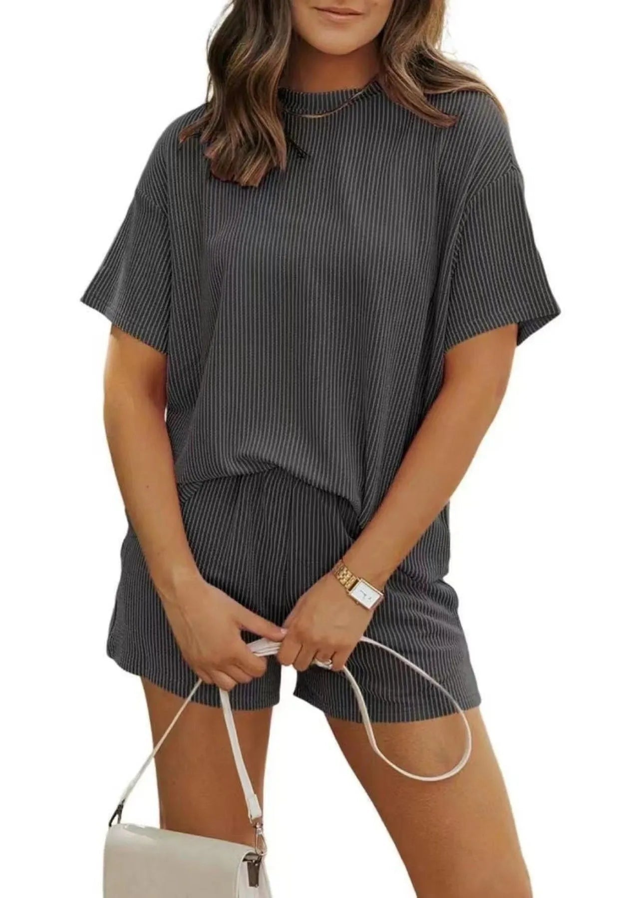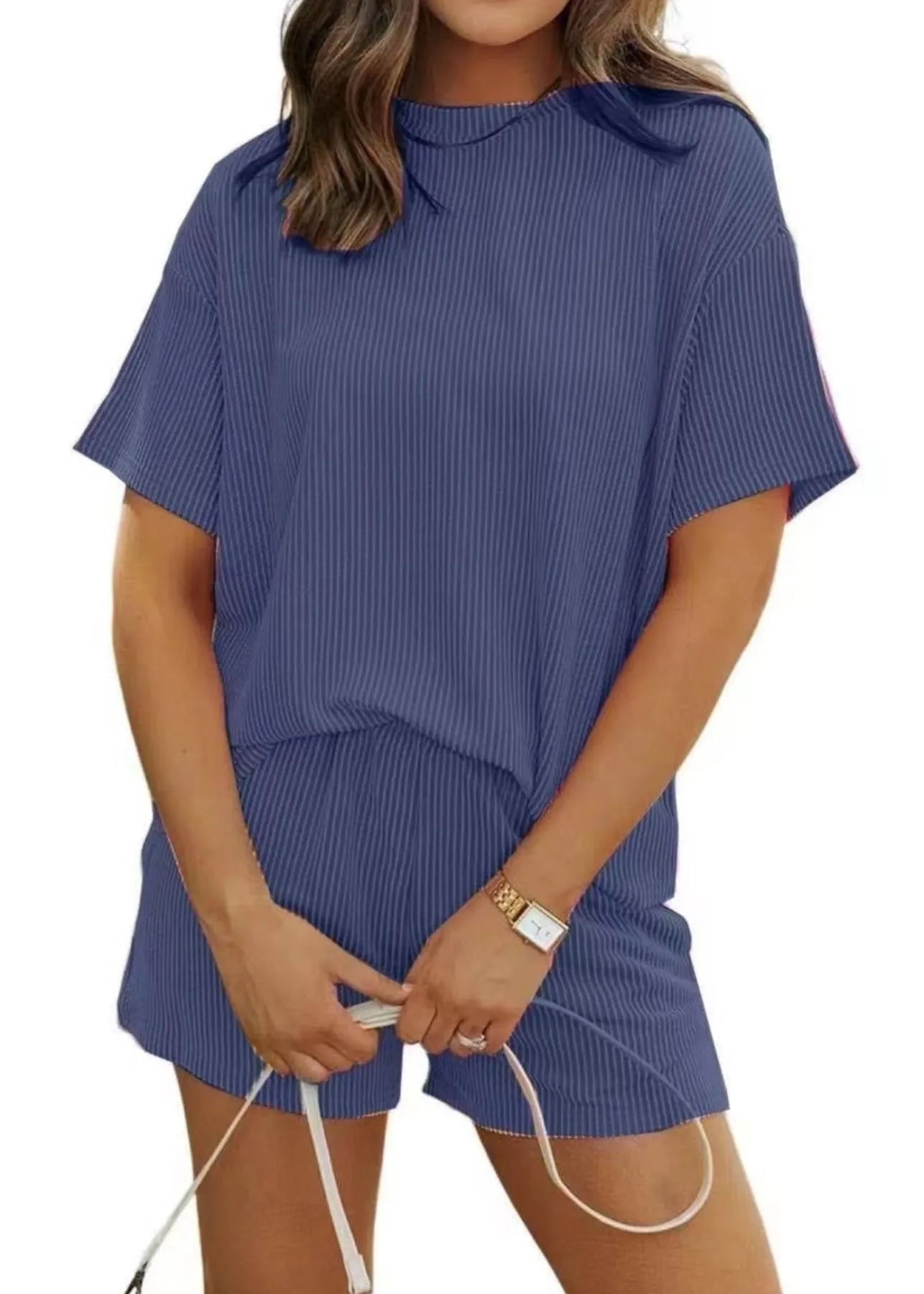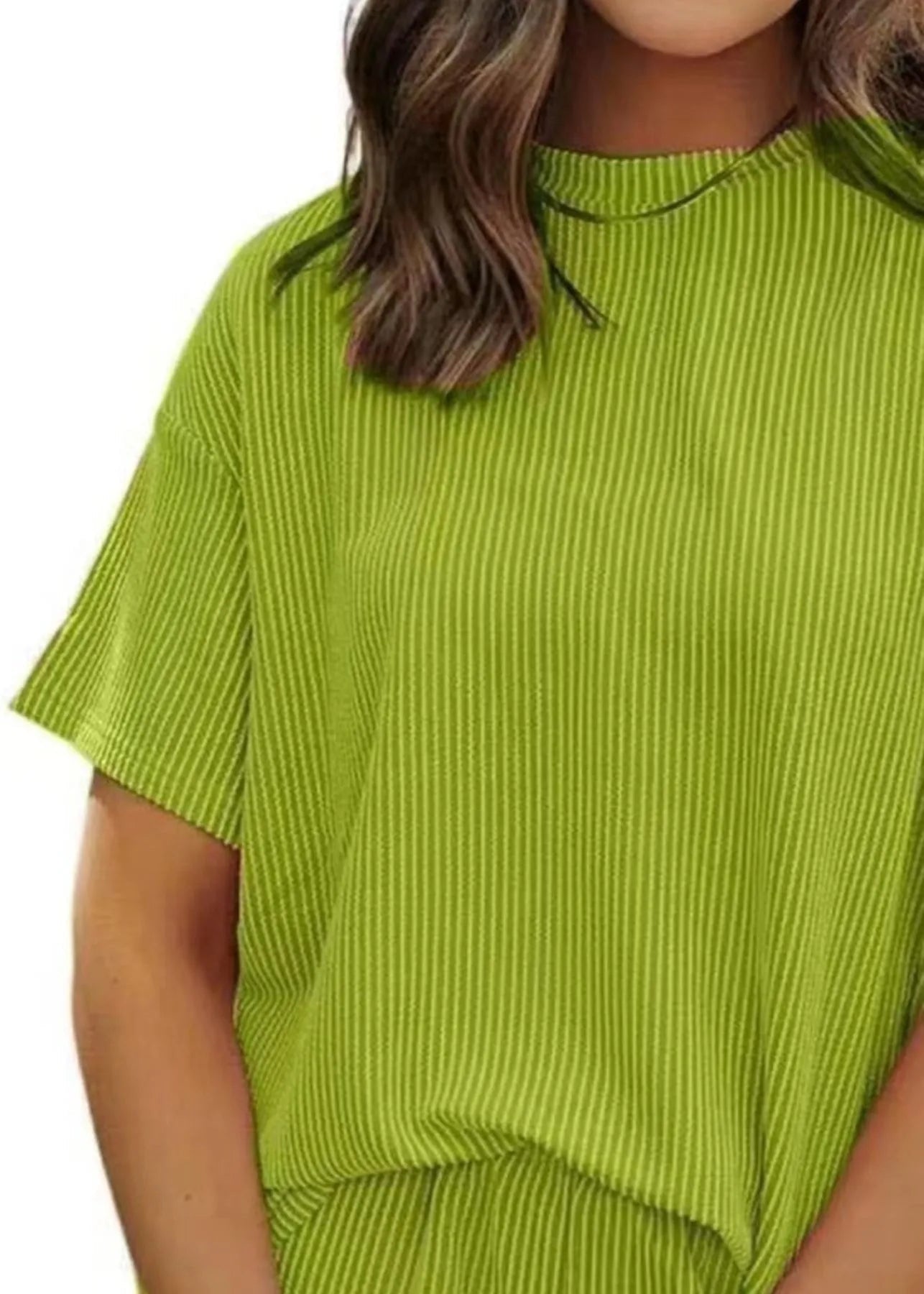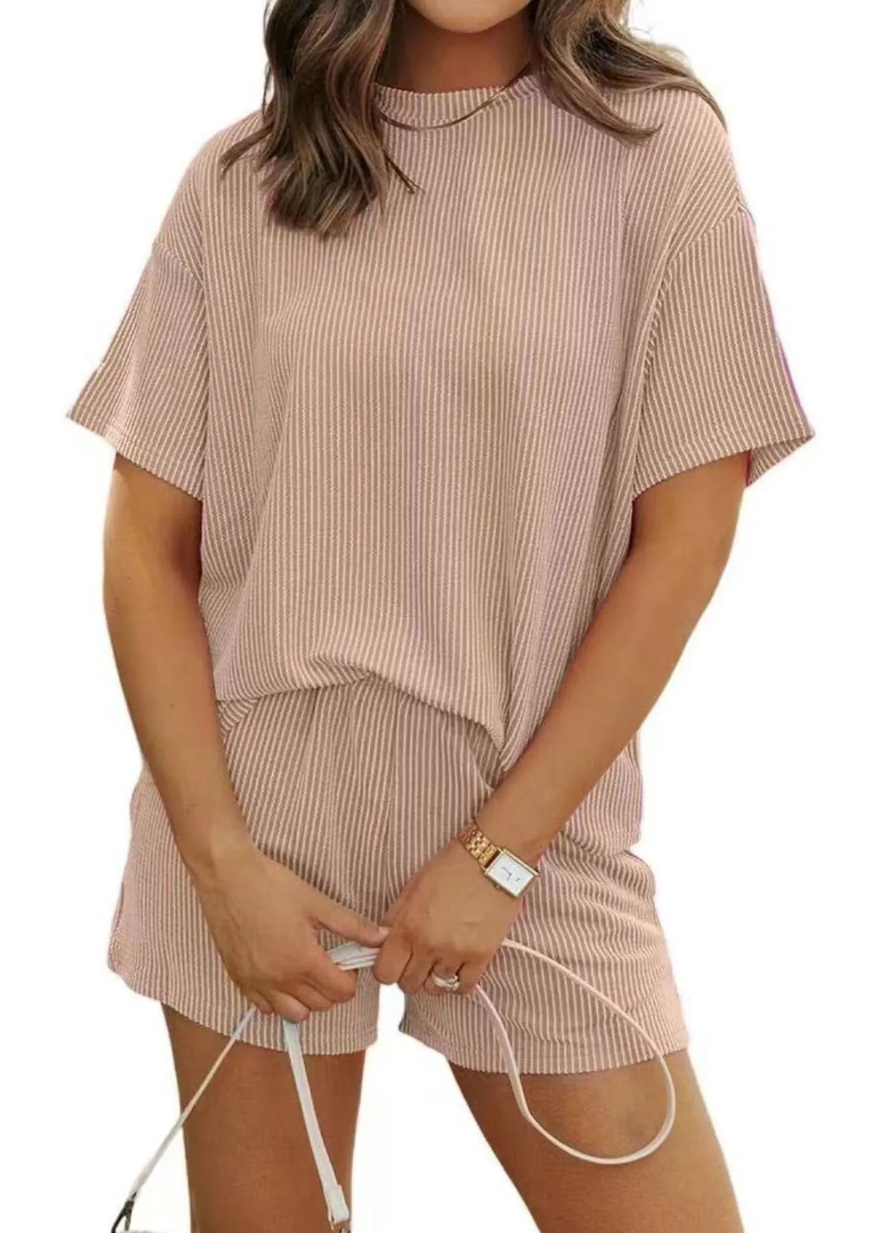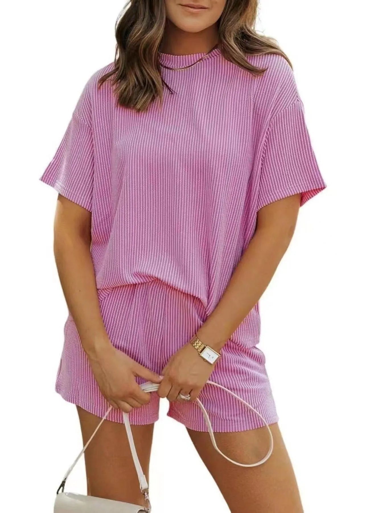 Le t-shirt à manches courtes présente une coupe ample et souple pour un confort maximal. Le short assorti avec ses poches pratiques complète ce look décontracté avec une touche de féminité et de fraîcheur.
