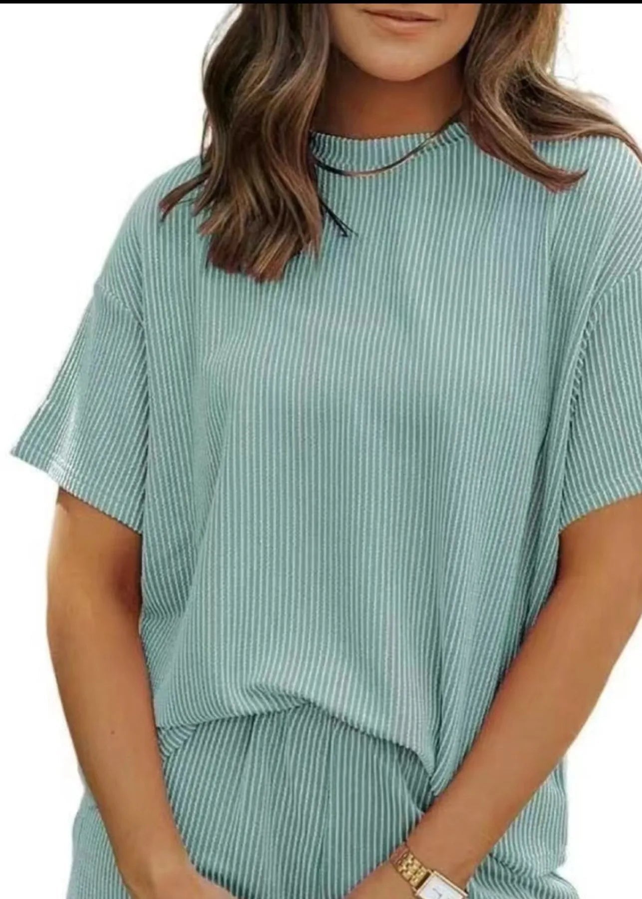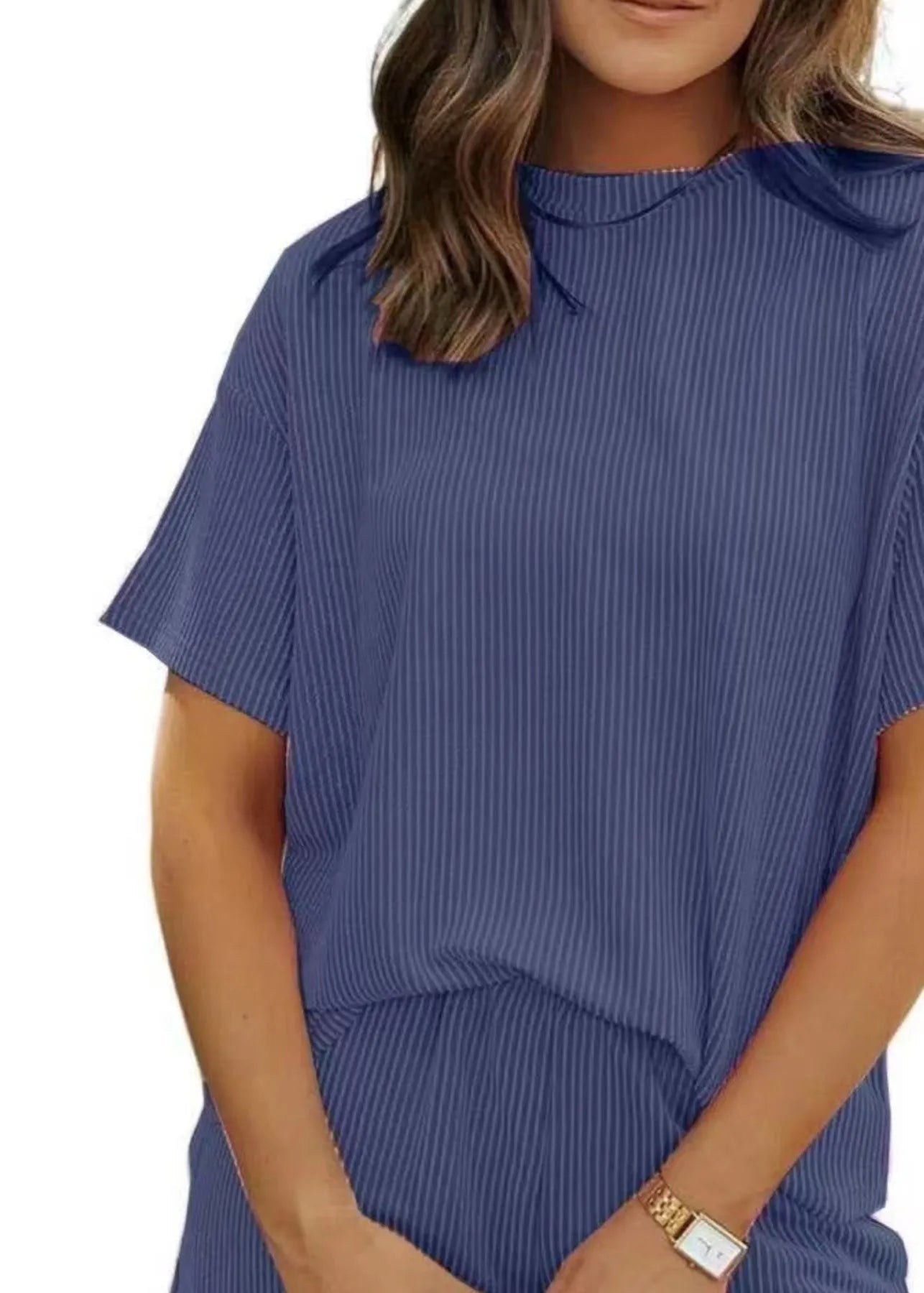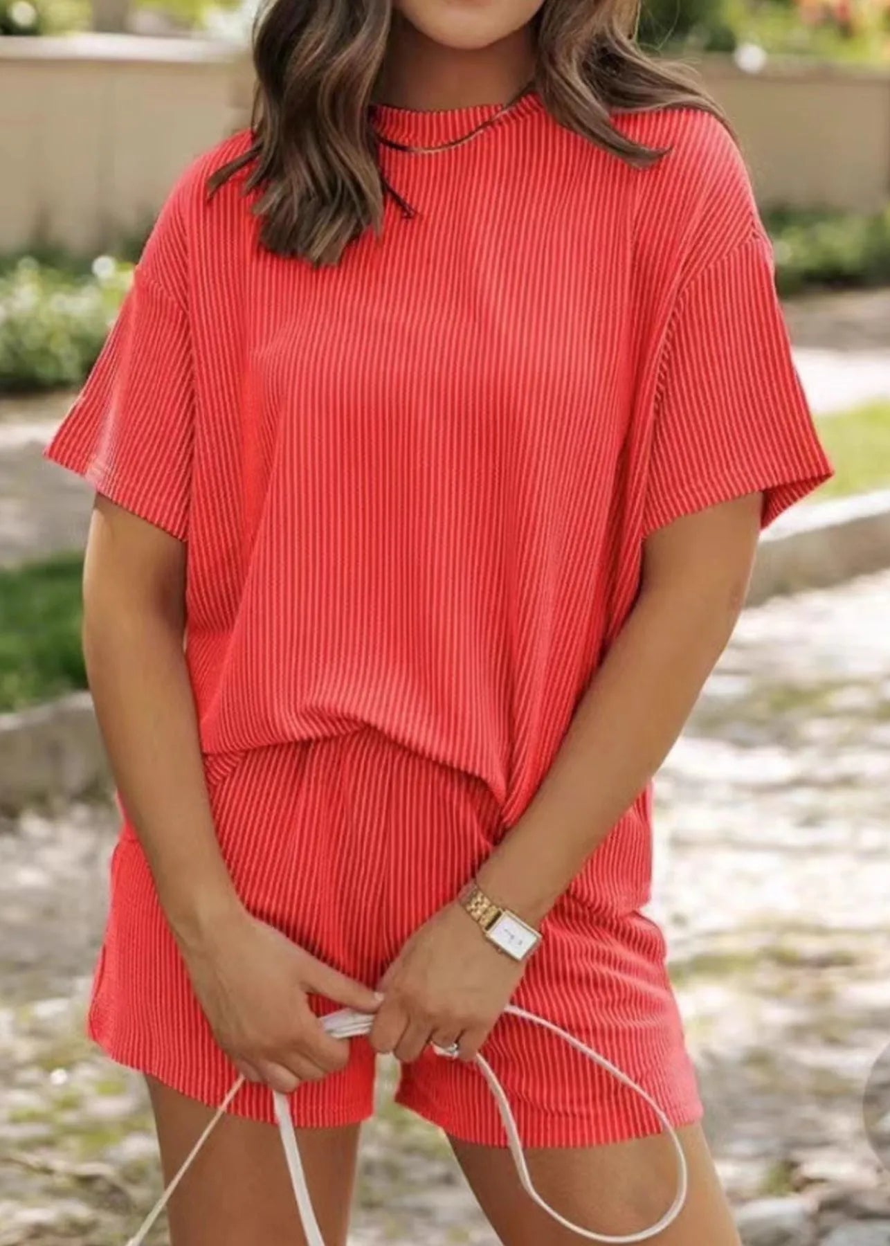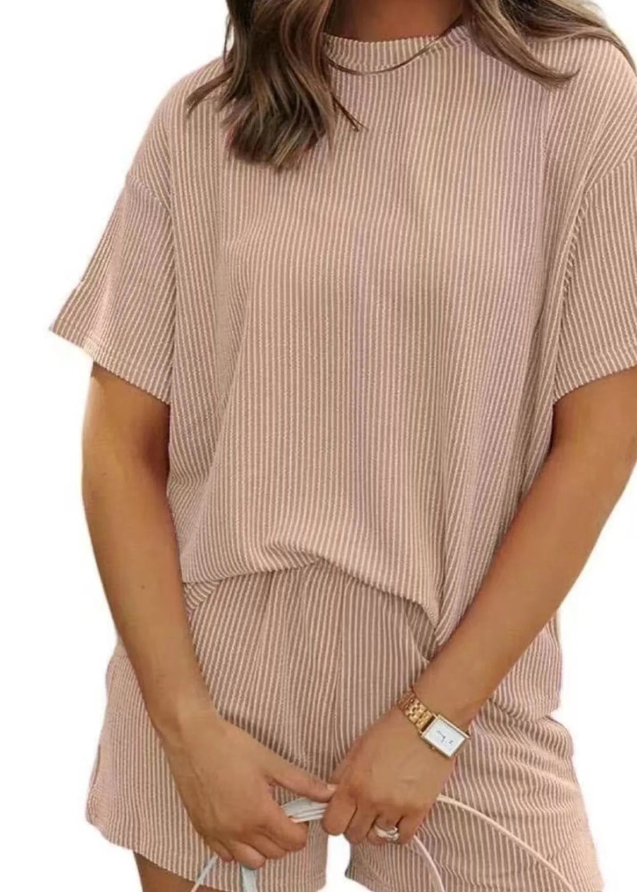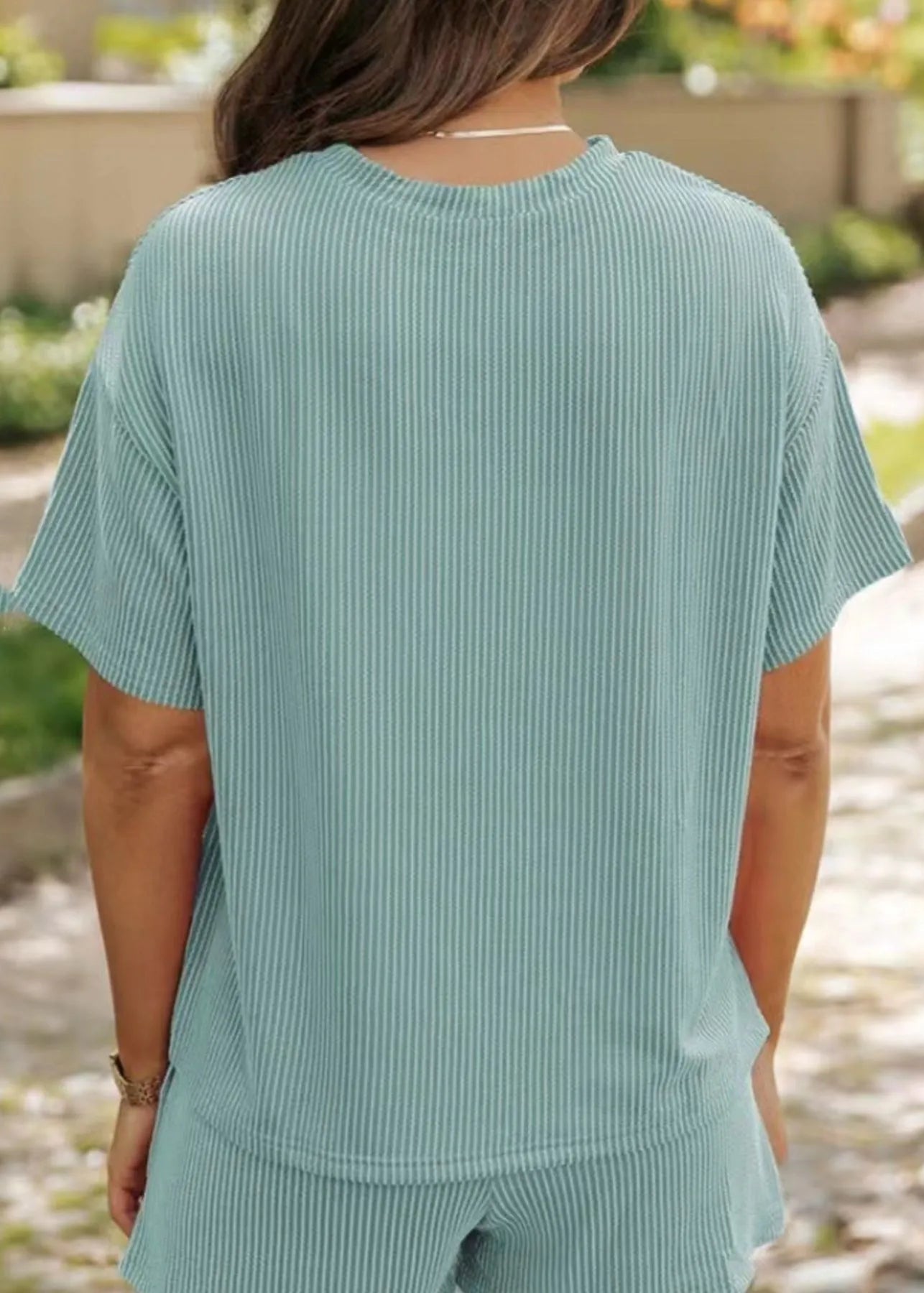 Le t-shirt à manches courtes présente une coupe ample et souple pour un confort maximal. Le short assorti avec ses poches pratiques complète ce look décontracté avec une touche de féminité et de fraîcheur.