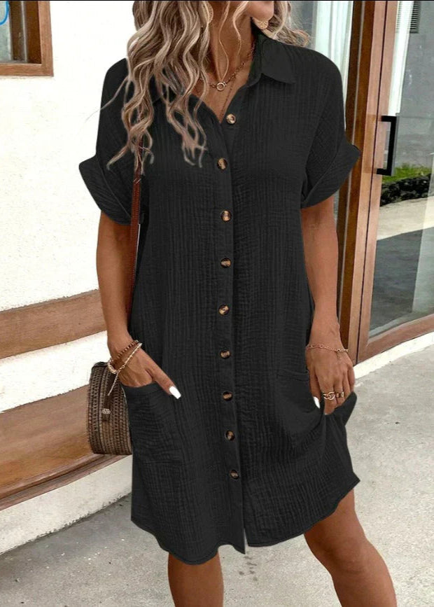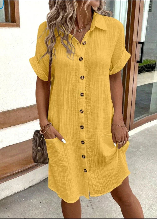 Notre robe chemise minimaliste en coton Macy est un véritable incontournable de la garde-robe estivale. Sa coupe fluide, ses manches retroussées et ses boutons décoratifs lui confèrent un look décontracté mais élégant. Confectionnée dans un coton doux et respirant, cette robe est idéale pour un usage quotidien, les vacances ou les escapades citadines.