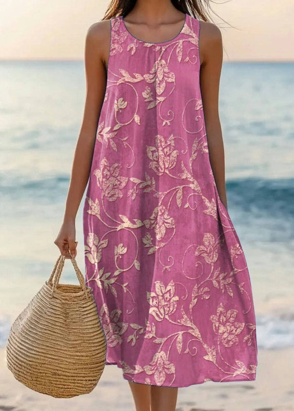 Laissez-vous séduire par cette charmante robe d'été rose ornée d’un délicat imprimé floral crème. Conçue pour les journées ensoleillées, cette robe sans manches à la coupe ample et fluide vous offre un confort optimal tout en sublimant votre silhouette avec légèreté.